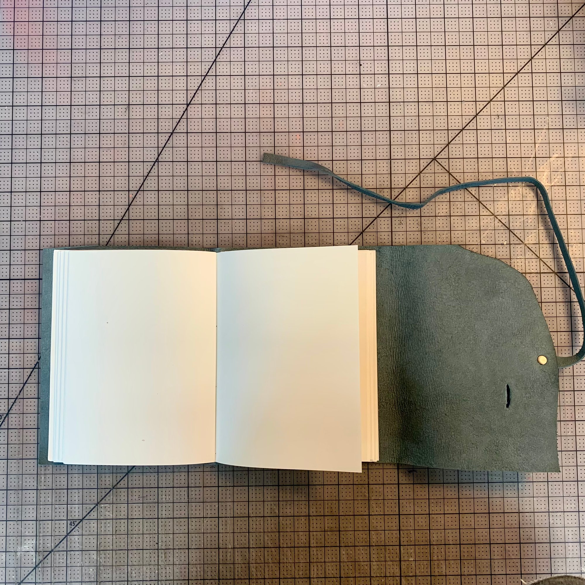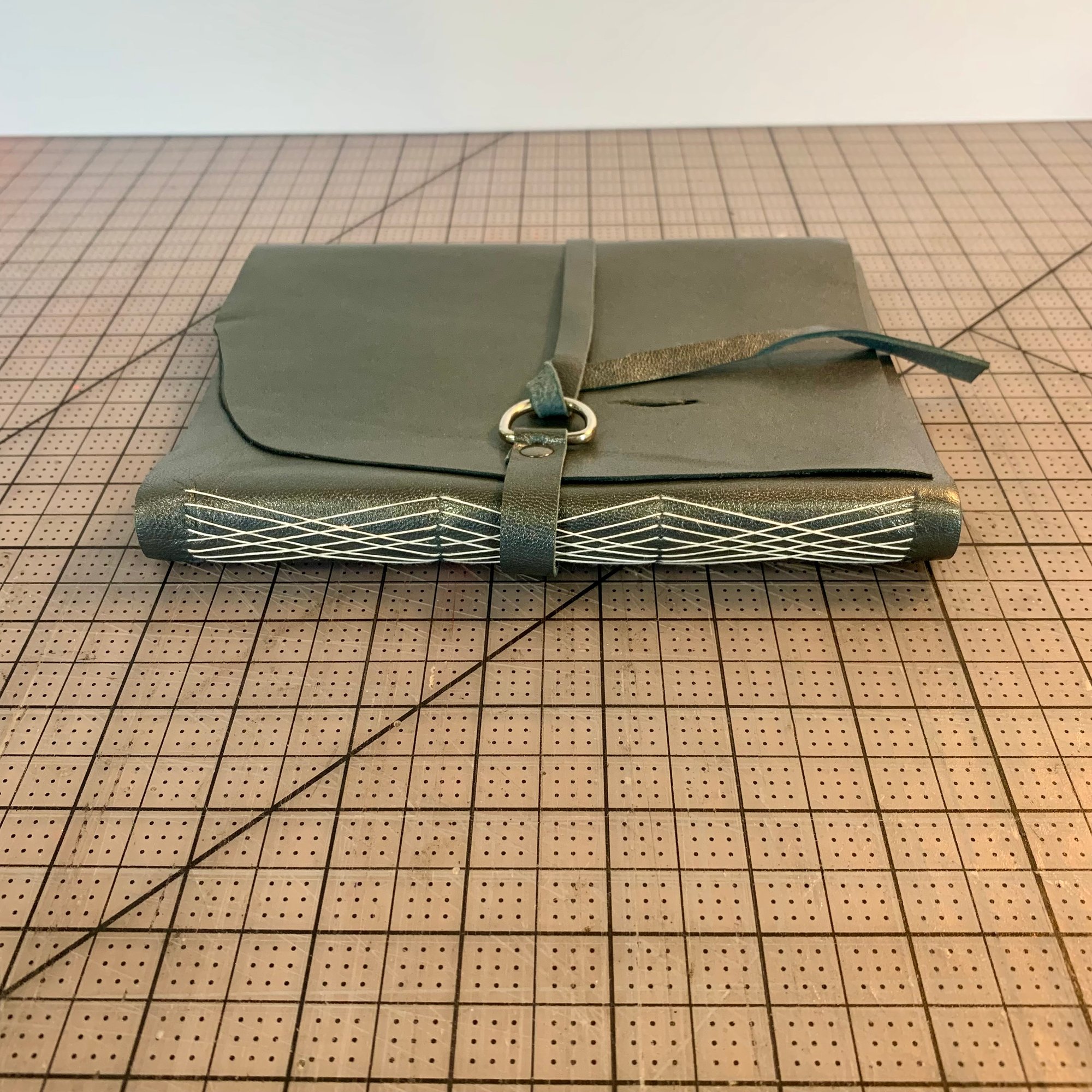 Chrome leather with white and brown cross stitching. Leather wrap closure. 80 blank pages of high quality text paper