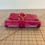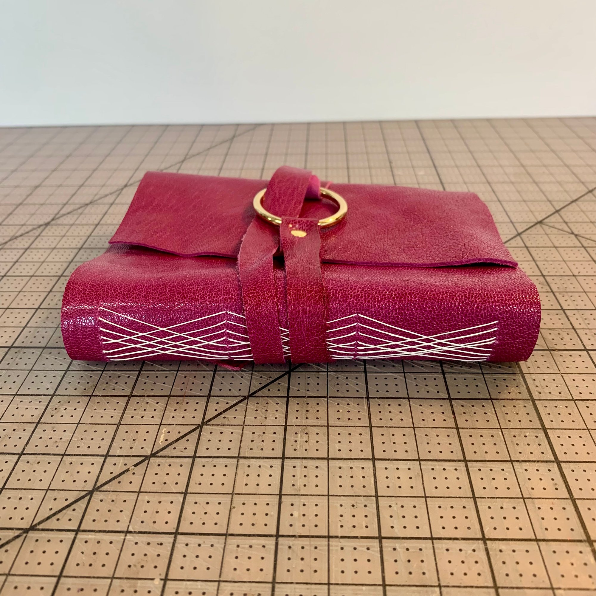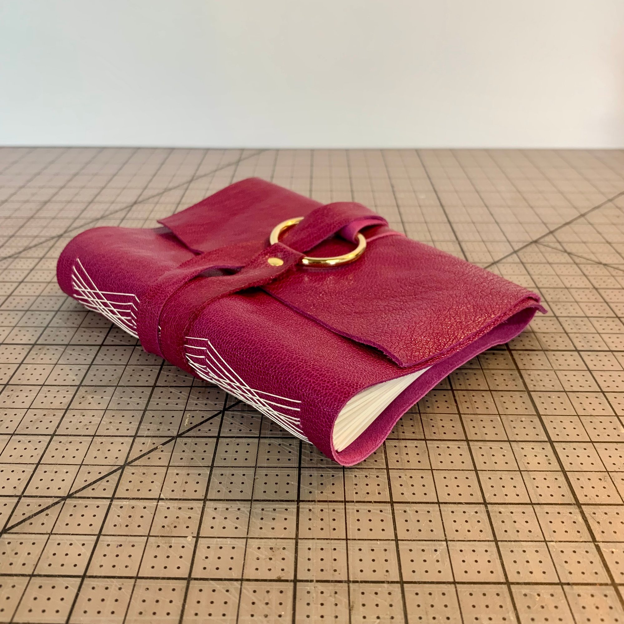 Pink leather with white cross stitching. Leather wrap closure. 80 blank pages of high quality text paper
