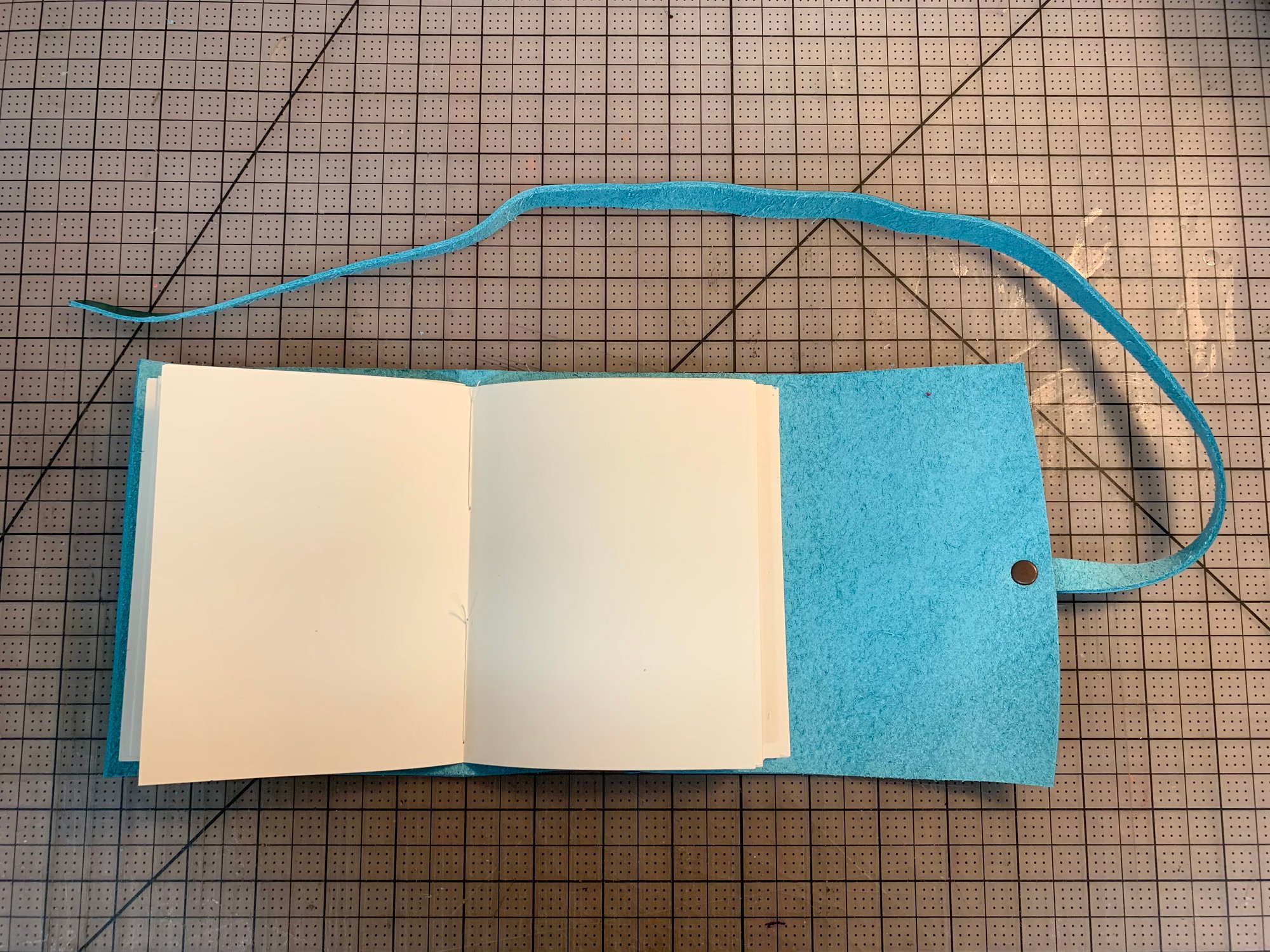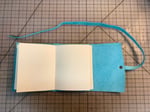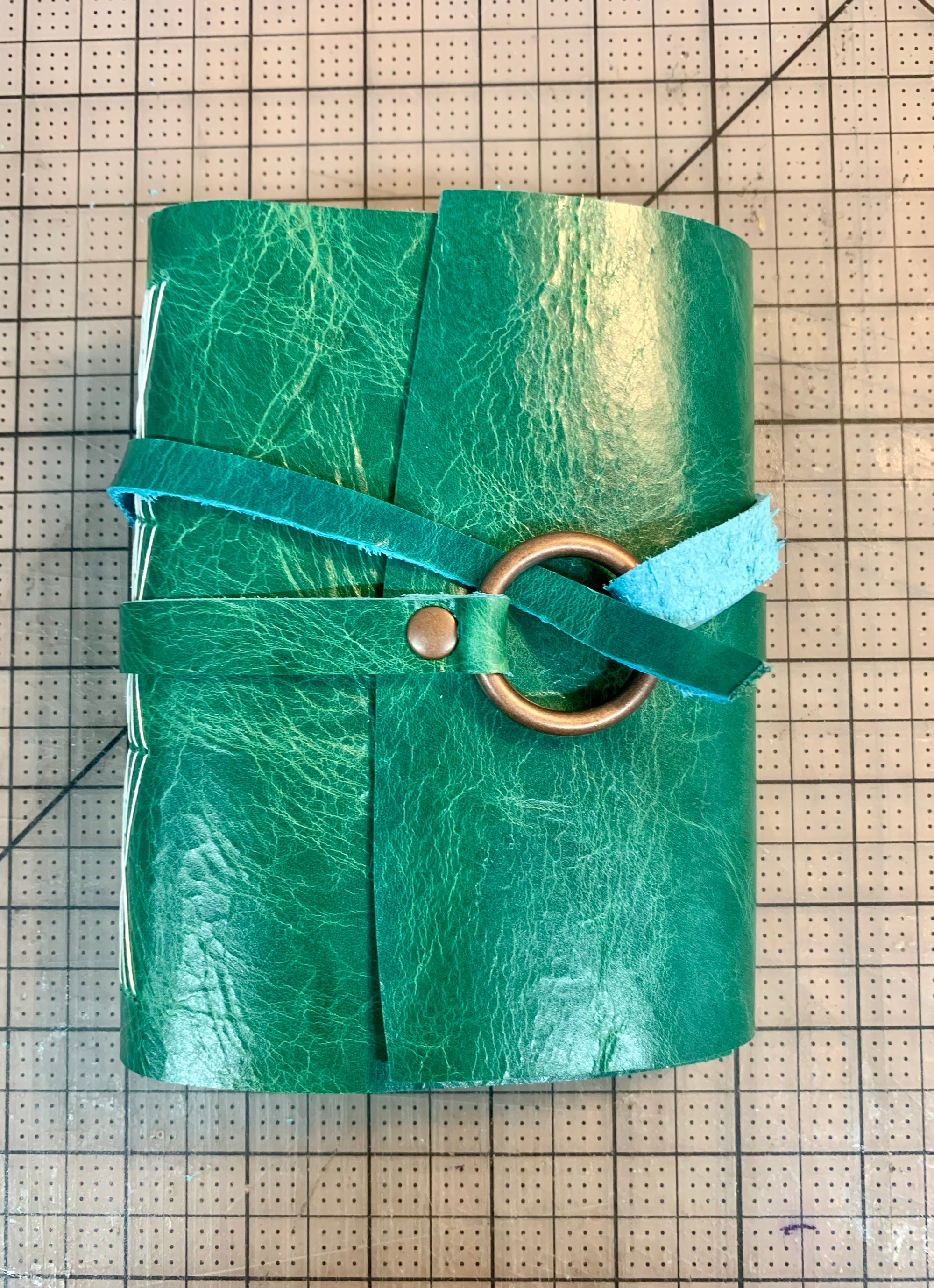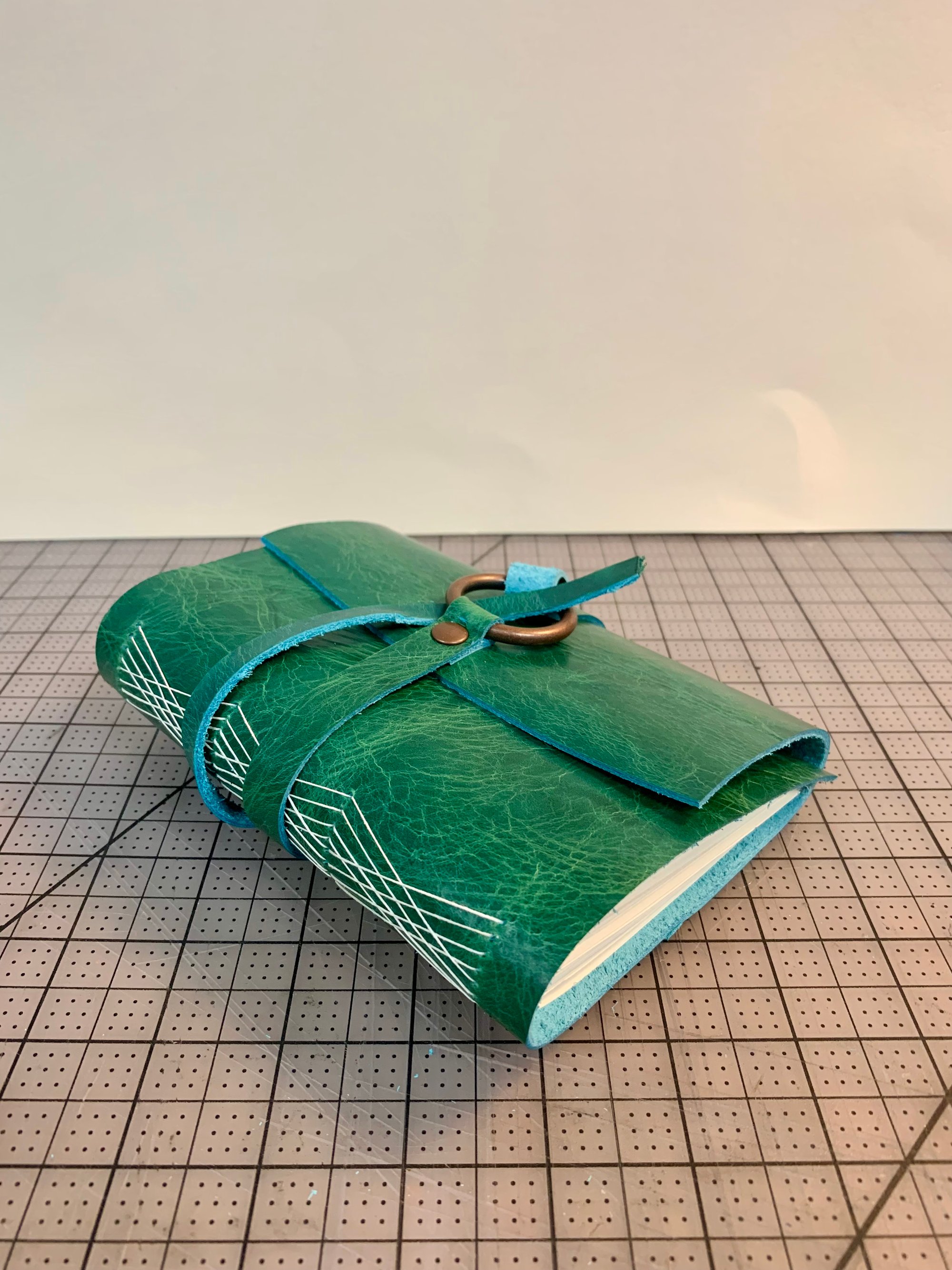Turquoise leather with white cross stitching. Leather wrap closure. 80 blank pages of high quality text paper